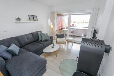 Lejligheden er renoveret i 2013 med blandt andet nyt køkken med opvaskemaskine. Her er glaskeramisk komfur, emhætte, køleskab med separat fryser på 10 liter. Der er trægulv over det hele med undtagelse af badeværelset som er belagt med klinker. Stuen er hyggelig indrettet med sofabord, sofagruppe, brændeovn, DVD-afspiller samt kabel-tv med DR, TV2, tysk EUROSPORT 1 og RTL. Her er også direkte udgang til den sydvestvendte balkon med havemøbler. Der findes også en anden stue med spisebord hvor der er en sofa, der kan laves om til sovesofa til 2. Her kan man vågne op til udsigt over limfjorden, men solens står op i øst. Herudover er der soveværelset med dobbeltseng samt en hems med en enkelt sovemulighed. Vær opmærksom på at for at komme op på hemsen skal man kravle op ad en ribbe. Har man el-bil eller en Plug-In hybrid, så er der 4 Ladebokse til Type 2 ladestik, der kan lade op til 11 kWh ved Feriecenteret – de er lige efter miljøstationen.