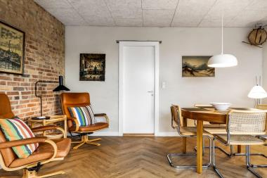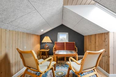 På første sal, tilgået via trappen i køkkenet, venter jer en lys og rummelig lille stue her er står også en dobbelt sovesofa med de to sovepladser.