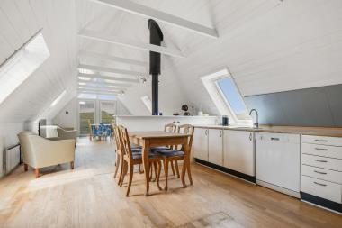 På første sal, tilgået via trappen i mellemgangen, venter jer en lys og rummelig stue med åben planløsning. Her kan I nyde panoramaudsigten over klitlandskabet og kystsikringsvejen. Køkkenet er veludstyret med en glaskeramisk kogeplade, emhætte, mikrobølgeovn, køleskab med fryser og opvaskemaskine. I stuen er der et spisebord ved det store panoramavindue og en hyggelig sofagruppe med TV, der giver adgang til både danske og tyske TV-programmer. En brændeovn bidrager til den behagelige atmosfære. Derudover er der et ekstra soveværelse med dobbeltseng på første sal.