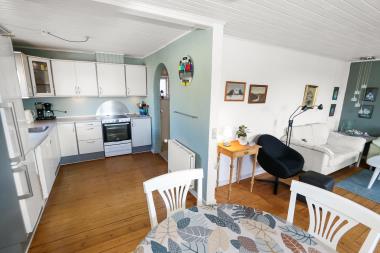 Huset er i 2 etager og er lyst og moderne. Stue og køkken er i samme rum og her er et behageligt trægulv. Køkkenet har glaskeramisk komfur, emhætte og køle/fryseskab. Stuen byder på brændeovn til træpiller (træpiller kan købes hos XL byg) spisebord, sofagruppe og hyggeligt møblement med fjernsyn hvor man kan se både tyske og danske kanaler blandt andet TV2. Herudover er der også DVD-afspiller tilknyttet.