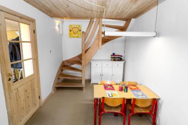Huset er i 2 etager og er lyst og moderne. Stue og køkken er i samme rum og her er et behageligt trægulv. Køkkenet har glaskeramisk komfur, emhætte og køle/fryseskab. Stuen byder på brændeovn til træpiller (træpiller kan købes hos XL byg) spisebord, sofagruppe og hyggeligt møblement med fjernsyn hvor man kan se både tyske og danske kanaler blandt andet TV2. Herudover er der også DVD-afspiller tilknyttet.