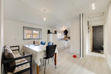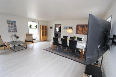 Når du går gemmem husets hoveddør mødes du af en flot entre med vaskemaskine, tørretumbler, ekstra håndvask og køkkenbordsplads. Fra entreen er der adgang til et lækkert køkken med alt i hvidevarer samt et lille ekstra rum med dart og siddepladser. Køkkenet råder bla over en glaskeramisk kogeplade, emhætte, opvaskemaskine, indbygningsovn, spiseplads og køleskab med fryseboks. flot minimalistisk opholdsstue med en dejlig sofa, spisebord, Smart-TV med danske kanaler samt mulighed for streaming af TV / radio / Apps samt Chromecast, så har du en mobiltelefon eller et andet device med kan du streame hvad du nu har abonnement. 3 soveværelser (1DS, 2ES, 2ES) samt 2 badeværelser. Det ene flotte, store badeværelse er med toilet, håndvask, bruser og flot klinkegulv med gulvvarme. I det andet badeværelse er det toilet, bruser og håndvask. I alle opholdsrum er der praktiske og rengøringsvenlige trægulve. Ikke ryger hus. Max. 1 husdyr tilladt.