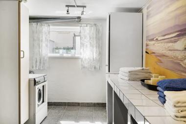 Når man træder ind i husets stueplan, bliver man mødt af en dejlig lys og indbydende indretning. Husets hjerterum og også største rum er den hyggelige stue. Stuen er indrettet med hjørnesofa, fjernsyn og skaber gode rammer for en familie eller par. Det næste rum i stueplanen er køkkenet, hvorfra man har den skønneste udsigt mod de maleriske klitter. I køkkenet er der alt hvad man skal bruge til en dejlig ferie ved vestkysten. Køkkenet er blandt andet udstyret med el-keramisk komfur, emhætte, opvaskemaskine og køleskab. I køkkenet er der derudover en lille hyggekrog, hvor man kan sidde på en bænk med en bog eller en god kop kaffe, mens den knitrende brændeovn varmer rummet op. På stueplanen ligger et af husets to badeværelser. Her er der toilet håndvask og en bruser. Ved siden af badeværelset i stueplanen ligger også et af fire hyggelige soverum. Her er der en dobbeltseng og også fra dette rum kan de skønne klitter ses. I kælderetagen ligger de tre andre soverum. Det ene er med en dobbeltseng, det andet er med en dobbeltseng og det tredje er med en enkeltseng. I kælderen er der desuden et vaskerum, hvor man kan vaske tøj i løbet af ferien hvis der er behov for det. Husets store badeværelse befinder sig også i kælderen, hvor der forefindes toilet, håndvask, brusekabine og også et badekar. Den lyse indretning i blå og hvid strækker sig gennem hele huset og giver en følelse af badehotelsstemning. Obligatorisk slutrengøring.