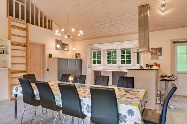 Lyst og moderne sommerhus til 8 personer, med sauna og spabad. Huset er indrettet med kombineret køkken og stue. Køkkenet er moderne indrettet med keramiskkomfur, opvaskemaskine, køleskab med frostboks og mikrobølgeovn. I entreen er der 150 liter skabsfryser. Stuen er rummelig og med loft til kip. I stuen er der er møbler af høj kvalitet, TV med såvel programmer fra Boxer, herunder DR og TV2 samt tilsluttet parabol med mange tyske og enkelte engelske kanaler. Der DVD-afspiller og stereoanlæg med CD-afspiller. Der er gratis internetforbindelse via en mobil forbindelse, som dog kan være ustabil til tider. Til de yngste gæster er der højstol og barneseng. Til en kølig sommeraften eller en efterårsaften med regn og rusk er der brændeovn til at sprede hygge og varme. Husets flotte badeværelse er indrettet med elegant spabad, toilet, bordarrangement med vask og god skabsplads. Der er behageligt gulvvarme. Fra badeværelset er der direkte adgang til husets sauna, hvor i kan blive varmet igennem efter en lang gå tur i områdets flotte natur. Huset råder over tre gode soveværelser. To er indrettet med dobbeltsenge og et med en køje til to personer. Der er desuden to sovepladser på husets hems hvor der er opsat ekstra TV. Der er praktisk entre med vaskemaskine og tørretumbler. Fra stuen er der adgang til husets terrasser hvoraf en del er overdækket. I kan nyde aftensmaden tilberedt på husets grill, på husets terrasse .Der er installeret varmepumpe i huset og det betyder at du som gæst kan spare en del på din elvarmeregning. Til børnene er der sandkasse og gynger. Et dejligt sommerhus velegnet til ferie på alle årstider, beliggende i rolige omgivelser. Ikke-ryger hus.