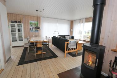 Opholdsstuen er møbleret med pæne møbler og har desuden brændeovn , farve tv med parabolantenne.