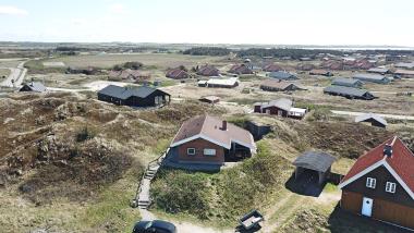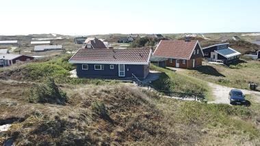Feriehuset ligger direkte i klitten på en 2600 kvadratmeter højtliggende grund. Husets sydvendte terrasse ligger godt beskyttet af klitten til den ene side og selve huset til nordsiden. Her er plads til 6 personer fordelt på 4 soverum. Vesterhavet ligger blot 170 meter fra huset, så her når man hen til solnedgangen indenfor få minutter.