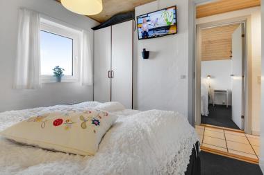Flot stue som går i èt sammen med køkkenet. I stuen er der brændeovn, varmepumpe, sofa, dabradio samt fladskærm. Her er det muligt at se danske og tyske kanaler kanalerne via fiberforbindelse. Der er også gratis internet, så streaming er også muligt, hvis man selv medbringer et device. Spisebordet befinder sig i grænselandet mellem stuen og køkkenet. Fra stuen er der direkte udgang til terrassen. Køkkenet er lækkert med gulvvarme, elektrisk komfur, køle-fryseskab, mikrobølgeovn og opvaskemaskine. Poolen måler 5,10 x 2,80 x 1,25 meter. Har svømmetræner og undervandsbelysning. Hertil er der ovenikøbet et 4 personers spabad samt en hyggekrog med fladskærm og bluetoohthøjtaler. Således kan man spille musik eller se sin yndlingsfilm fra for eksempel spabadet. Poolrummet har ligeledes sit eget badeværelse med gulvvarme, bruser, toilet, vask og sauna. Det andet badeværelse har bruser, toilet og vask. Der er 3 store soveværelser henholdvis 2 med dobbeltsenge og 1 med 2 enkeltsenge. I værelserne med dobbeltsenge er der tilmed installeret en fladskærm i hvert værelse. Hertil kommer der et børneværelse, hvor der er barneseng og puslebord. Til huset hører også 2 barnestole, så det er let at have den lille med. I bryggerset forefindes der vaskemaskine og tørretumbler til at lette feriedagen. Der er tilladt et husdyr, og det er ikke tilladt at ryge i huset. Depositum vintersæson kr. 3000 og sommersæson kr. 2200. Der er gratis træ ved huset som I som gæster må bruge.