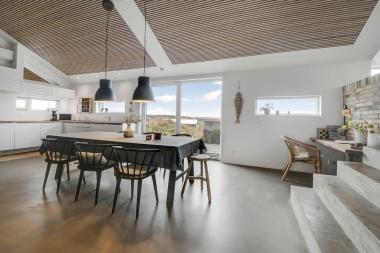 På en 2500 m2 dejlig, kuperet naturgrund med en fantastisk udsigt til klitterne, og kun 200 m fra Vesterhavet, ligger dette pragtfulde feriehus på 125 m2 + redskabsrum. Huset er minimalistisk i sit udtryk og praktisk indrettet. En flot entrè byder velkommen indeholdende skabe samt vaskemaskine og tørretumbler. Køkken alrummet er med loft til kip og betongulv. Her findes der en brændeovn, og køkkenet indeholder opvaskemaskine, keramisk kogeplade, ovn, køl og frys samt vinkøleskab. Fra køkken alrummet er der en opgang til opholdsstuen, hvor der ligeledes er loft til kip samt parketgulv. Heroppe findes der er et fladskærms-TV med danske og tyske kanaler samt chromecast. Chromecast gør det muligt via mobiltelefonen eller tablet at se film eller streaming på fladskærmen. Herudover er der en bluetooth-højtaler som også gør det muligt at høre radio eller musik via egen mobiltelefon. Huset indeholder stort badeværelse med toilet, håndvask, spa, sauna, bruseniche og gulvvarme samt udgang til ugeneret udendørsbruser et plus når man lige kommer fra stranden. Der er et mindre badeværelse med bruseniche toilet, håndvask og gulvvarme. Huset har 3 fine soveværelser med parketgulve og skabe (1DS, 1DS,, 1DS).  Der er gratis trådløs internetadgang. Der findes varmeluftpumpe, som reducerer varmeforbruget. Rygning eller husdyr er ikke tilladt.