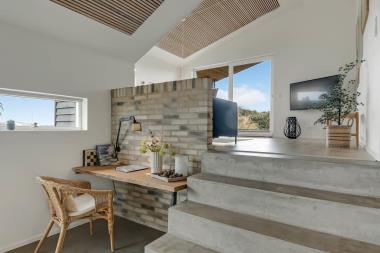 På en 2500 m2 dejlig, kuperet naturgrund med en fantastisk udsigt til klitterne, og kun 200 m fra Vesterhavet, ligger dette pragtfulde feriehus på 125 m2 + redskabsrum. Huset er minimalistisk i sit udtryk og praktisk indrettet. En flot entrè byder velkommen indeholdende skabe samt vaskemaskine og tørretumbler. Køkken alrummet er med loft til kip og betongulv. Her findes der en brændeovn, og køkkenet indeholder opvaskemaskine, keramisk kogeplade, ovn, køl og frys samt vinkøleskab. Fra køkken alrummet er der en opgang til opholdsstuen, hvor der ligeledes er loft til kip samt parketgulv. Heroppe findes der er et fladskærms-TV med danske og tyske kanaler samt chromecast. Chromecast gør det muligt via mobiltelefonen eller tablet at se film eller streaming på fladskærmen. Herudover er der en bluetooth-højtaler som også gør det muligt at høre radio eller musik via egen mobiltelefon. Huset indeholder stort badeværelse med toilet, håndvask, spa, sauna, bruseniche og gulvvarme samt udgang til ugeneret udendørsbruser et plus når man lige kommer fra stranden. Der er et mindre badeværelse med bruseniche toilet, håndvask og gulvvarme. Huset har 3 fine soveværelser med parketgulve og skabe (1DS, 1DS,, 1DS).  Der er gratis trådløs internetadgang. Der findes varmeluftpumpe, som reducerer varmeforbruget. Rygning eller husdyr er ikke tilladt.