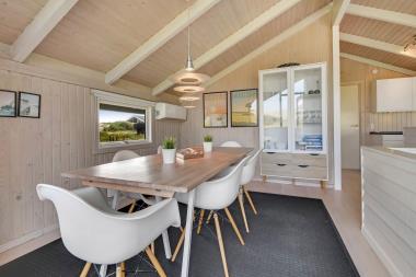 86 m2 stort, moderne træhus til max. 6 personer og med 4 soverum (1DS, 1DS, 1DS, 1ES). Opholdsstuen, som er forsænket i forhold til køkken og spiseafdeling, er med komfortable møbler og Smart-TV med digitalt TV og Chromecast så der mulighed for streaming af TV / radio / Apps, så har du en mobiltelefon eller et andet device med kan du streame hvad du nu har abonnement, radio/DVD/CD-afspiller. Sæt dig i sofaen og tænd op i brændeovnen og lyt til din yndlings-CD og brændeovnens knitren og nyd udsigten til klitterne. Godt indrettet køkkenafdeling med alle tænkelige hjælpemidler bl.a. opvaskemaskine, komfur med keramiske kogeplader, emhætte, mikroovn og køle-fryseskab. Køkkenet er kombineret med opholds-/spisestuen. Huset har installeret varmepumpe, som gør det energibesparende. Ekstra opbevaringsrum lige ved hovedindgangen. Badeværelse med bruser, toilet, håndvask og vaskemaskine samt gulvvarme. Barnestol. Ikke ryger hus. Husdyr ikke tilladt