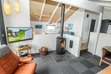 Huset indeholder en forsænket pejsestue kombineret med spisestue og køkken. Køkkenet er åbent og veludstyret. Pejsestuen er indrettet med lædermøbler, TV med danske og tyske programmer og en skøn brændeovn, som giver en hyggelig varme i de kolde perioder på året. Der er desuden DVD og stereoanlæg med CD. Spisestuen har et stort vinduesparti, så man fra spisebordet har en flot udsigt ud over området. Nyrenoveret badeværelse med toilet, håndvask og bruser og vaskemaskine. Huset har 4 soverum: 3 med dobbeltsenge og et med 2 enkeltsenge. Fra gangen er der adgang til husets sauna. Huset har 2 nyrenoverede terrasser, som er udstyret med havemøbler og liggestole. 1 husdyr er tilladt. Ikke ryger-hus.