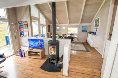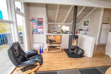 Husets stue er delt op i flere afdelinger hvor de har det tilfælles at der er store vinduer med lysindfald direkte fra himlen over Vesterhavet. Pejsestuen er nedsænket og rummer udover kamin også møblement, stuebord og fjernsyn. Til fjernsynet hører en DVD-afspiller samt man kan se DR, TV2 og tyske satellitkanaler. Herudover er der også et stereoanlæg med CD i huset. I den anden stuedel er der et hyggeligt spisebord med stole. Herfra kan man ligeledes titte ud over klitgrunden og eventuelt høre vindens blæsen, mens man hygger sig indenfor i varmen med en god middag. Der er ligeledes en barnestol i huset til de allermindste.
