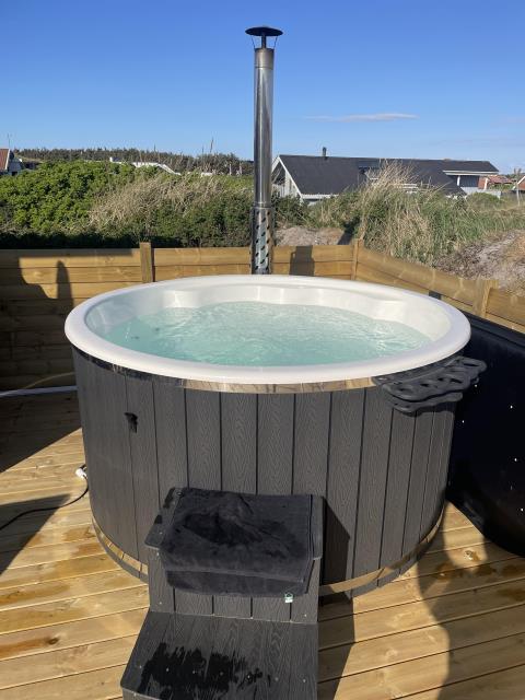 Huset ligger på en ca. 2.600 m2 stor klitgrund. På den store terrasse er der vildmarksbad som opvarmes med jeres medbragte brænde. Der er udgang til 3 dejlige terrasser som er forbundet med en dejlig flisebelagt gangsti, i 2025 er terrasserne blevet gjort størrer. Terrassen med udgang fra køkkent er delvis overdækket. Der er havemøbler og solvogne til rådighed samt en gasgrill. Fra terrasserne kan man høre havets brusen. Nyd en gåtur ved Vesterhavet. Find sten og rav eller sæt jer i klitterne og nyd solnedgangen over havet.