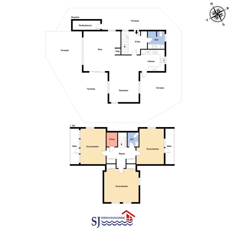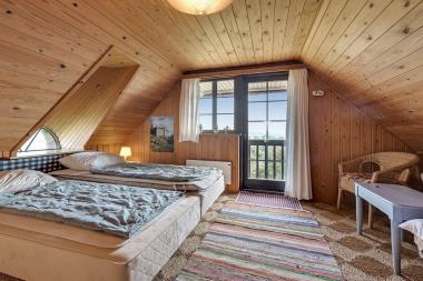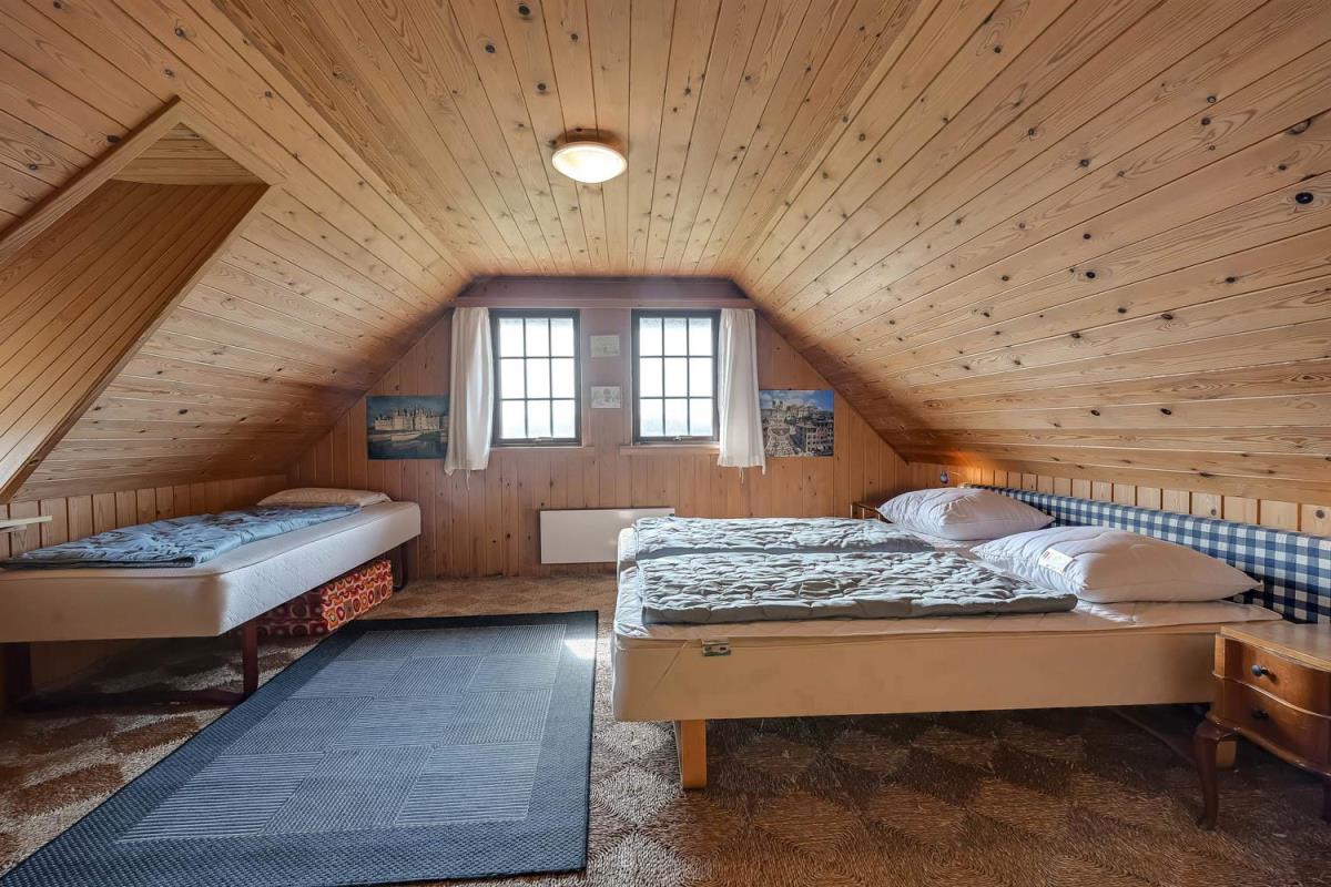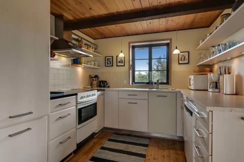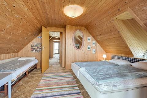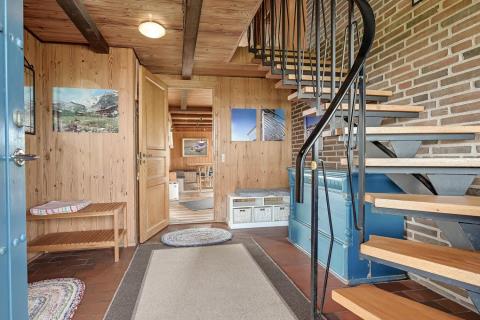 Fint stenhus i 2 etager på 160 m2 bygget i 1977. En stejl flisebelagt stifører op til huset. Første rum, man træder ind i, er husets entre. Her er der plads til at hænge jakker og stille sko. Fra entreen kommer man ud i husets badeværelse: Toilet, håndvask, bruser og vaskemaskine. Videre fra entreen kommer man ud i husets opholdsrum, som består af køkkenet, spisestue og stuen, hvor alle rum er belagt med trægulv. Køkkenhjørnet med lyse køkkenelementer er indrettet med glaskeramisk komfur, emhætte, mikroovn, køle-/fryseskab og opvaskemaskine. Rundt om hjørnet fra køkkenet er spisestuen, hvor der er plads til alle husets beboer. I stuen er der et hyggeligt sofahjørne med polstermøbler og siddehjørne med hynder og puder, hvor man eksempelvis kan sætte sig til rette og læse en bog eller se fjernsyn. Fjernsynet er et Smart-TV med DR1, tyske kanaler og der er mulighed for streaming af egne streamingtjenester, hvor man selv har abonnement. Desuden er der CD- og DVD-afspiller. På 1. sal ligger husets 3 soveværelser, hvorfra 2 af værelserne har udgang til en overdækket altan. I hvert soveværelse er der 2 enkeltsenge, der er skubbet sammen til en dobbeltseng, og desuden er der i 2 af værelserne en mere enkeltseng. (1DB + 1ES, 1DB + 1ES, 1DS). På 1. sal er der også et gæstetoilet med toilet og håndvask.