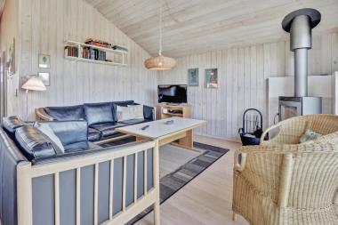 Stue og køkken er med trægulv og er klassisk sommerhusindrettet med loft til kip. Fra stuen er der et større vinduesparti mod vest, som både lyser stuen op, men også “tager” naturen og vejret ind i stuen. Stuen er indrettet med lækre lædermøbler og brændeovn. I stuen findes fladskærm med flere tyske kanaler. Herudover er der gratis internet (fibernet), DVD-afspiller, radio og CD-afspiller i huset.
