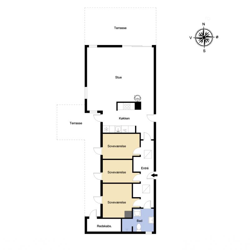 Fra opholdsstuen er der udgang til en dejlig overdækket terrasse med havemøbler, liggestole og grill. Der er også en dejlig morgenterrasse lang med huset. Huset ligger skjult bag en række træer som både giver læ – men også sørger for en særdeles ugeneret ferie. Et rigtig godt sommerhus med den perfekte beliggenhed på en dejlig klitgrund helt tæt på det unikke Vesterhav som er et dagligt besøg værd både på solrige- som på blæsende dage. Hop ind i bilen eller tag cyklen og hent morgenbrød til familien i hos de nærved liggende supermarkeder. Så hvad enten du er til aktiv ferie eller total afslapning, danner dette feriehus en dejlig ramme både hvad angår hus, beliggenhed og omgivelser.
