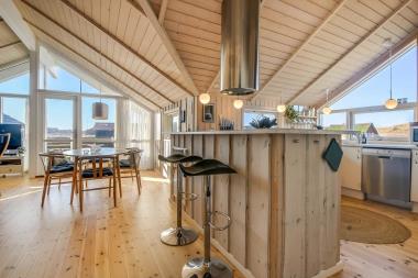 Huset er 96 m2 stort og er meget lyst og velindrettet med store vinduespartier, som giver et fantastisk lysindfald. Der er åbent til kip i stuen, og de lyse trævægge, trægulve og trælofter giver sammen med lysindfaldet fra de store vinduer en lys og venlig atmosfære i rummet. Køkkenhjørnet er veludstyret og indeholder alt i hårde hvidevarer. Der er opvaskemaskine, mikroovn, glaskeramiske kogeplader, indbygningsovn, emhætte og køle/fryseskab. Opholdsstuen er med komfortable lædermøbler, Smart-TV med danske og tyske programmer samt Chromecast, som giver mulighed for streaming af TV / radio / Apps. Så har du en mobiltelefon eller en tablet, kan du stream, hvad du har abonnement til. Til TV’et er tilkblet en DVD afspiller med blue-ray. Desuden har stueområedet en Digital Radio med CD-afspiller hvor du også kan stream din musik.. Slap af foran den knitrende brændeovn som sammen med varmepumpen hjælper med at reducere udgiften til varmeregningen. Husets 3 soverum er indrettet med 1DS + 1DS + 2S, og så er der desuden en alkove i stuen med 2 sovemuligheder. Dejligt stort badeværelse med toilet, håndvask, bruser, spabad, gulvvarme og direkte adgang til sauna. I entrén finder du vaskemaskine og tørretumbler samt adgang til ekstra toilet med håndvask og gulvvarme. Max. 2 husdyr er tilladt. Dette hus er et ikke rygerhus.
