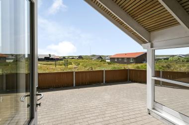 Huset er omgivet af en stor terrasse, som er indhegnet, her er der altid mulighed for at finde læ og nyde solen. Der er naturligvis havemøbler, solvogne og en grill, så man kan få den hyggelige stemning på terrassen og nyde aftensmaden direkte fra grillen. Fra dette hus er der blot 150 m til den dejlige, hvide sandstrand og Vesterhavet, hvor man kan få mange timer til at gå med lange spadsereture eller blot sidde i en klit og nyde havets brusen og den afslappende ro, et hav giver. Vil man ud på tur, kan man tage det lokale VLTJ tog, som kører fra Vemb til Thyborøn. Der er mulighed for at købe en familiebillet, som kan bruges en hel dag, hvilket kan give mulighed for at besøge både havnebyen Thyborøn og Lemvig uden at skulle bruge bilen. Offentlig legeplads blot 200-300 m fra huset. Ladestation til E-biler findes 100 m fra huset.