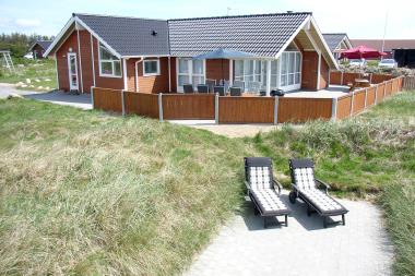 Huset er omgivet af en stor terrasse, som er indhegnet, her er der altid mulighed for at finde læ og nyde solen. Der er naturligvis havemøbler, solvogne og en grill, så man kan få den hyggelige stemning på terrassen og nyde aftensmaden direkte fra grillen. Fra dette hus er der blot 150 m til den dejlige, hvide sandstrand og Vesterhavet, hvor man kan få mange timer til at gå med lange spadsereture eller blot sidde i en klit og nyde havets brusen og den afslappende ro, et hav giver. Vil man ud på tur, kan man tage det lokale VLTJ tog, som kører fra Vemb til Thyborøn. Der er mulighed for at købe en familiebillet, som kan bruges en hel dag, hvilket kan give mulighed for at besøge både havnebyen Thyborøn og Lemvig uden at skulle bruge bilen. Offentlig legeplads blot 200-300 m fra huset. Ladestation til E-biler findes 100 m fra huset.