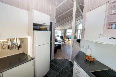 Køkkenet er kombineret som et hjørne af stuen og her forefindes glaskeramisk komfur, køleskab, mikrobølgeovn, opvaskemaskine og en separat fryser på 20 liter. Stuen er møbleret med flotte møbler og er udstyret med brændeovn, fladskærms-tv med danske og tyske tv-kanaler, DVD, stereoanlæg med CD. Huset har endvidere 3 soveværelser hvoraf 2 er med dobbeltsenge og 1 med 2 enkeltsenge. Hertil er der en ekstra barneseng i huset og 1 barnehøjstol. I alle opholdsrum og soverum er der lagt nyt trægulv. Badeværelset er dejlig komfortabelt med gulvvarme, spa, sauna, toilet, håndvask og bruser. Der er desuden vaskemaskine og tørretumbler i huset. Har man el-bil eller en Plug-In hybrid, så er der til huset et type 2 ladestik, der kan lade op til 11 kWh – den passer til blandt andet Tesla.