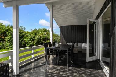 Fra stuen er der udgang til en delvis overdækket, lukket terrasse, hvor du finder havemøbler, solvogne og en gasgrill – perfekt til afslappende dage i solen eller hyggelige grillaftener. Terrassen er designet, så du altid kan finde læ og nyde solen. Til de mindste gæster er der gynger og sandkasse.
