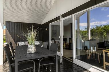 Fra stuen er der udgang til en delvis overdækket, lukket terrasse, hvor du finder havemøbler, solvogne og en gasgrill – perfekt til afslappende dage i solen eller hyggelige grillaftener. Terrassen er designet, så du altid kan finde læ og nyde solen. Til de mindste gæster er der gynger og sandkasse.