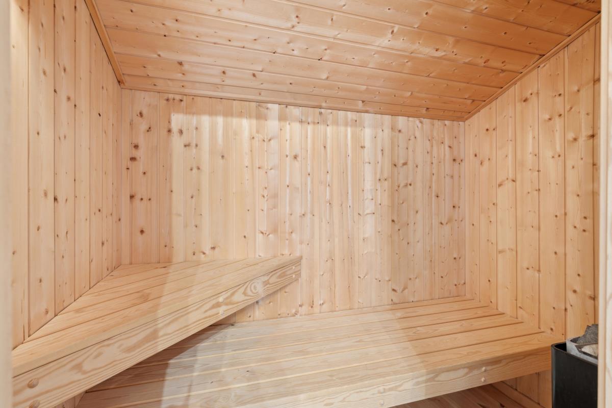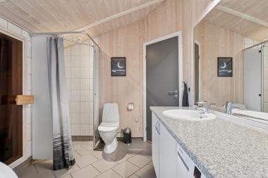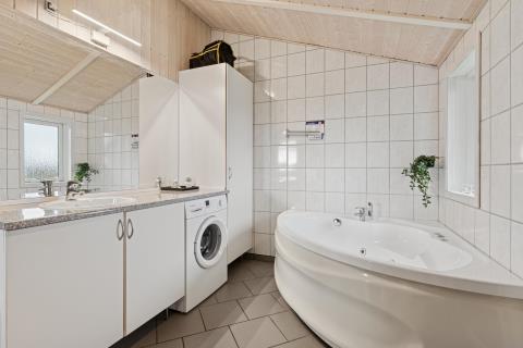 Det rummelige badeværelse er indrettet med bruser, toilet og håndvask og byder desuden på spa, sauna og gulvvarme, så I kan forkæle jer selv efter en dag ved stranden eller på vandretur. Der er også vaskemaskine til rådighed.