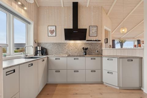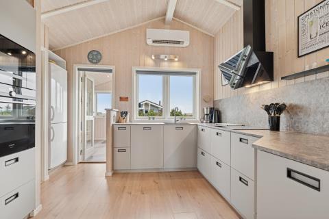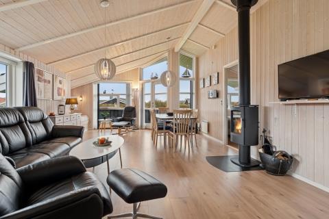Køkkenet fremstår lyst og venligt med store vinduespartier, der lukker masser af dagslys ind. Det er veludstyret med blandt andet opvaskemaskine og mikroovn og ligger i åben forbindelse med den hyggelige opholdsstue. Stuen er smagfuldt møbleret og byder på brændeovn, varmepumpe, fladskærms-tv med tyske og danske kanaler og Chromecast– ideelt til hyggelige aftener året rundt.