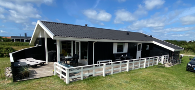 Fra stue og køkkenrummet er der 2 udgange til terrasseanlægget. Terrassen har både havemøbler, grill og 2 solvogne, så her er udstyret i orden til mange hyggelige afslappende timer. Der er kun 300 meter til Vejlby Torv med købmanden og Cafe John Wayne, så dette gør kun ferien endnu mere komfortabel. Vejlby Klit er omgivet af vand på begge sider med Vesterhavet mod vest som altid er et besøg værd. Her kan man bade, lave sandslotte, fiske, flyve med drage eller ganske enkelt blot gå een lang tur og nyde ensomheden eller familiens nærvær. Det samme gælder iøvrigt den tætte beliggenhed til Ferring Sø hvor der går en vandrerute rundt om.