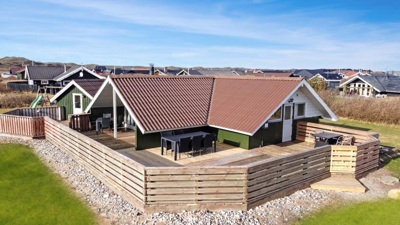 Renoveret, hyggeligt indrettet feriehus i træ med stor, lukket og delvis overdækket terrasse. Beliggende på naturgrund kun 400 meter fra Vesterhavet. Terrassen er indhegnet og dermed egnet til at man kan have sin hund gående løs rundt. Her er desuden gratis trådløs internetadgang (fiberforbindelse). Fra huset er der udsigt over området og huset er ideelt til parret eller den lille familie.