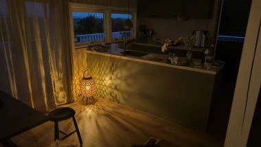 Det moderne køkken indeholder alt, hvad I behøver for at nyde gode måltider i ferien: varmluftsovn, keramiske kogeplader, opvaskemaskine, airfryer og en kaffemaskine til morgenkaffen. Badeværelset byder på gulvvarme og en lille sauna – perfekt til at slappe af efter en frisk tur ved havet.
