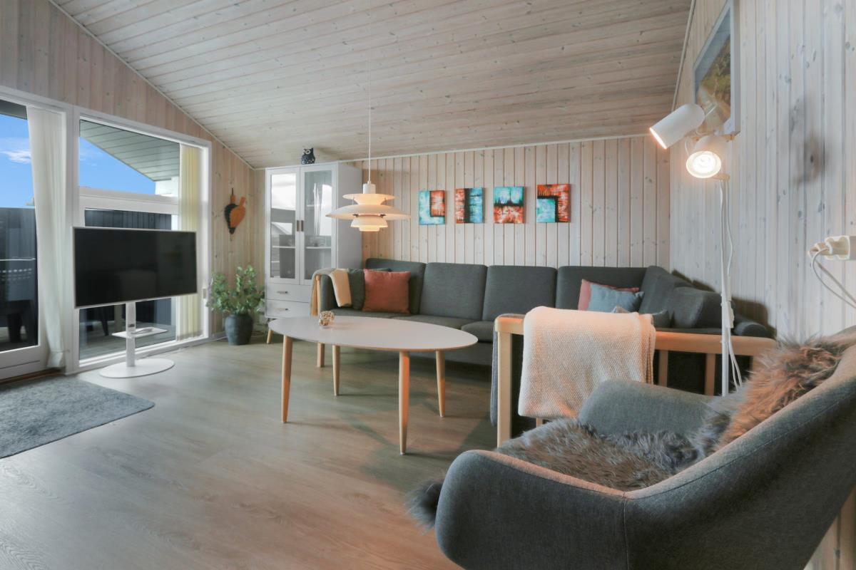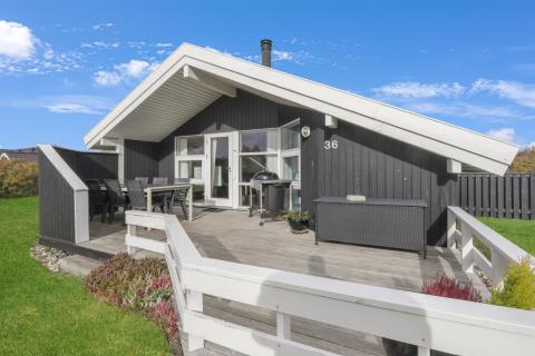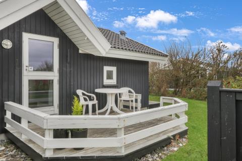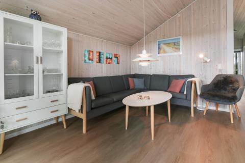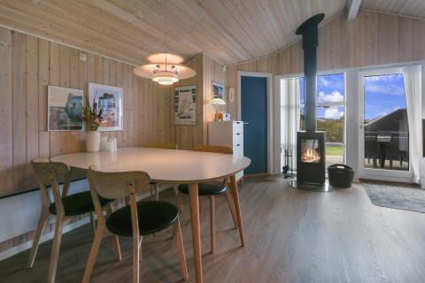 Feriehuset er på 65 m² og har plads til seks personer. Indretningen er lys og indbydende med en hyggelig kombineret stue og køkken. Det pæne og moderne køkken er veludstyret med komfur med glaskeramiske kogeplade, emhætte, opvaskemaskine, mikroovn samt køle-/fryseskab, så du nemt kan tilberede dagens måltider. Spisepladsen ligger i forlængelse af køkkenet og danner rammen om hyggelige måltider med familien.