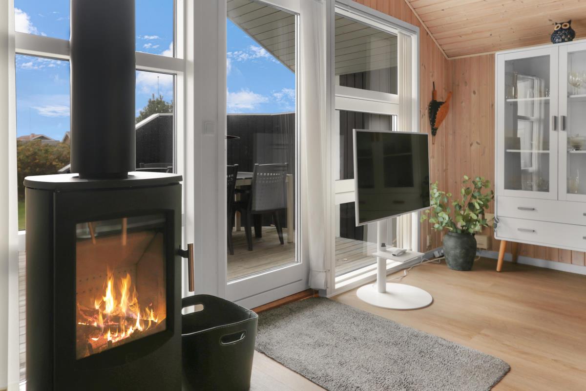 Brændeovnen skaber en dejlig varme og en hyggelig atmosfære på kølige dage, uanset årstiden.