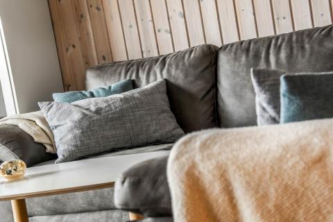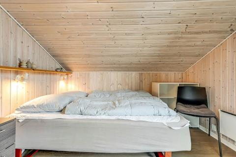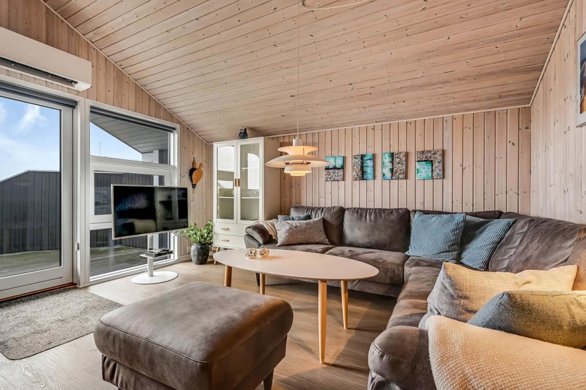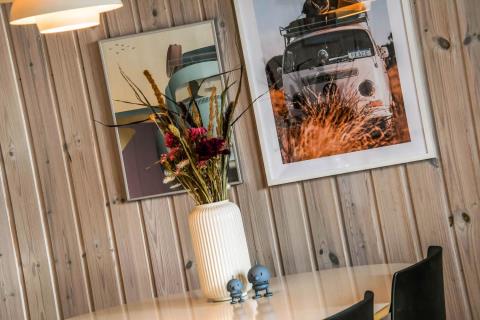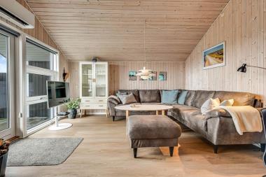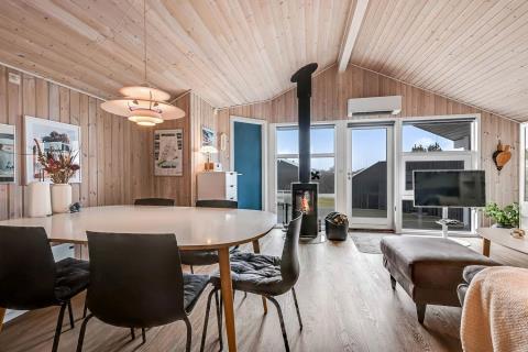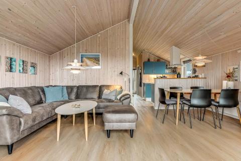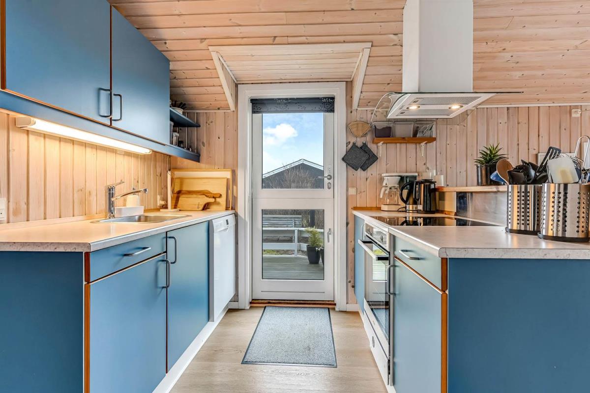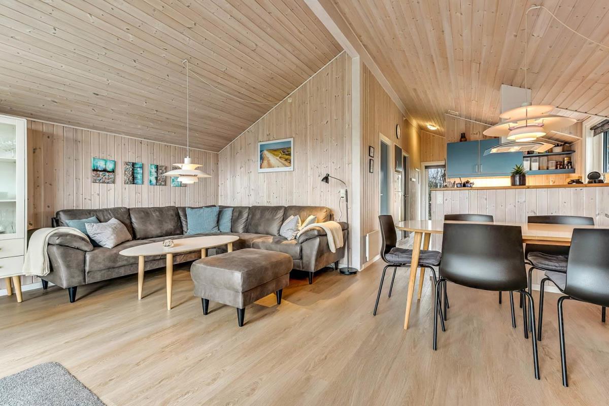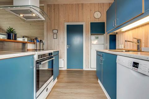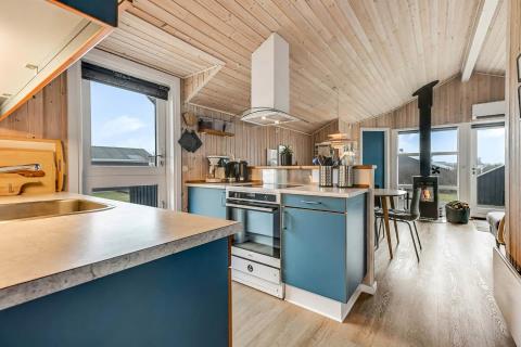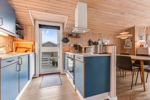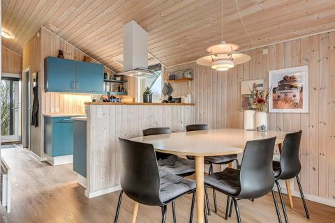 Feriehuset er på 65 m² og har plads til seks personer. Indretningen er lys og indbydende med en hyggelig kombineret stue og køkken. Det pæne og moderne køkken er veludstyret med komfur med glaskeramiske kogeplade, emhætte, opvaskemaskine, mikroovn samt køle-/fryseskab, så du nemt kan tilberede dagens måltider. Spisepladsen ligger i forlængelse af køkkenet og danner rammen om hyggelige måltider med familien.