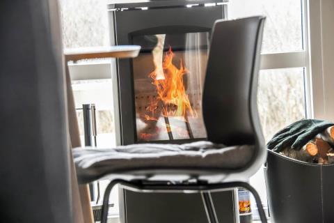 Brændeovnen skaber en dejlig varme og en hyggelig atmosfære på kølige dage, uanset årstiden.