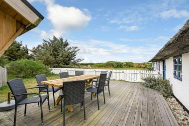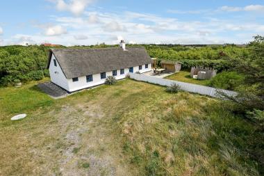 Beliggende på en dejlig privat grund på ca. 1.950 m2. Huset er beliggende tæt på en lille sø, hvor man fra terrassen med bord og bænkesæt kan sidde og nyde udsigten over søen. Huset ligger ca. 500 m fra indkøb og 750 m fra Vesterhavet. Fra lille entre er der udgang til naturgrunden og den dejlige nyanlagte træterrasse. Ved deb ene gavl af huset er der opstillet en bænk for her er der altid læ og der er det perfekte sted til at nyde en kop kaffe eller en god bog. Havemøbler og grill. Også området madsted ligger ca. 500 fra huset. Inden for 25-30 minutter kan flere aktiviteter og shoppingmuligheder nås.