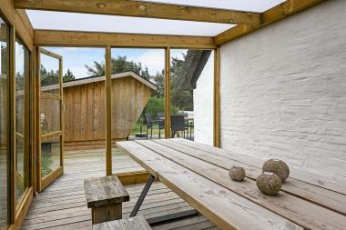 Beliggende på en dejlig privat grund på ca. 1.950 m2. Huset er beliggende tæt på en lille sø, hvor man fra terrassen med bord og bænkesæt kan sidde og nyde udsigten over søen. Huset ligger ca. 500 m fra indkøb og 750 m fra Vesterhavet. Fra lille entre er der udgang til naturgrunden og den dejlige nyanlagte træterrasse. Ved deb ene gavl af huset er der opstillet en bænk for her er der altid læ og der er det perfekte sted til at nyde en kop kaffe eller en god bog. Havemøbler og grill. Også området madsted ligger ca. 500 fra huset. Inden for 25-30 minutter kan flere aktiviteter og shoppingmuligheder nås.