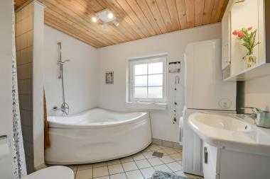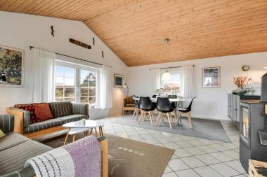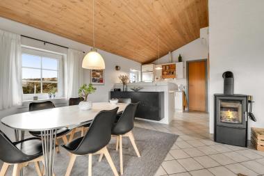 Dette smagfuldt indrettede feriehus i 2 etager er beliggende ideelt ved yderste klitrække blot 150 m fra Vesterhavet. Huset er meget smagfuldt indrettet og fremstår lyst og venligt. Hyggeligt indrettet stue som er kombineret med et velindrettet køkken som er indrettet med elkomfur, køleskab med frostboks, mikroovn og opvaskemaskine. Stuen er godt indrettet med dejlige lædermøbler, spisebord, F-TV med parabol samt med mulighed for streaming af egne programmer, PlayStation 3 med spil og en dejlig brændeovn som giver en behagelig varme også på de kolde årstider. 3 soverum med DS + DS + 4K. Flot badeværelse med toilet, håndvask, bruser, spa, vaskemaskine, tørretumbler og adgang til sauna, flisegulv med gulvvarme. I entreen er der trappe til 1. sal hvor der findes en lille hyggelig stue med ekstra TV og trægulve, herfra er der en fantastisk udsigt over området og de høje klitter ved Vesterhavet fra den lille altan. Husdyr tilladt. Ikke rygerhus.
