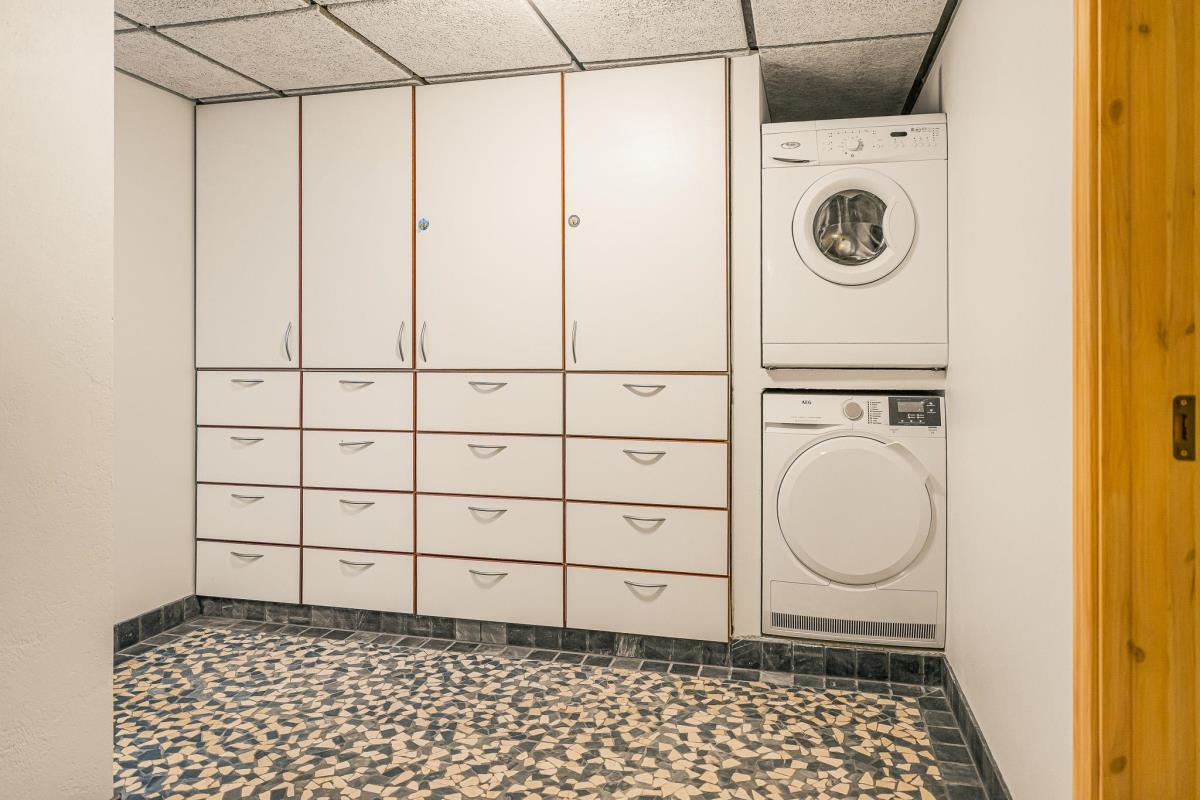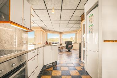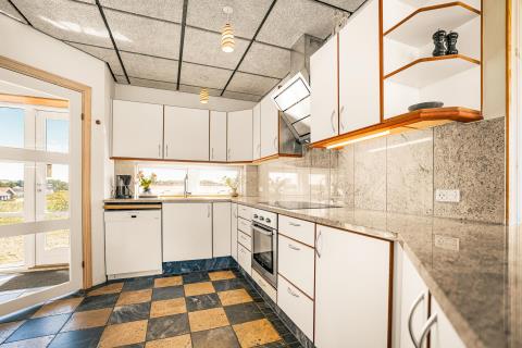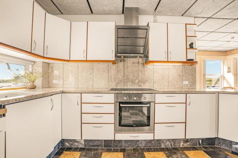 Det åbne og moderne køkken er udstyret med alt, hvad I har brug for til både hverdag og fest: el-keramisk kogeplade, indbygningsovn, opvaskemaskine, emhætte, køleskab og separat fryser. Det stilrene design og de praktiske løsninger gør madlavning til en fornøjelse – hvad enten I laver en hurtig frokost eller tilbereder en lækker middag til hele familien.