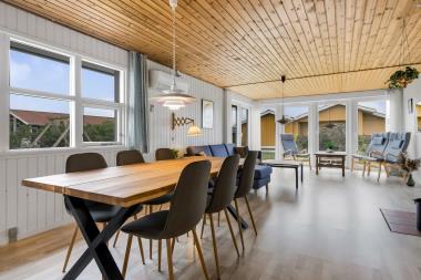Pænt og godt indrettet feriehus på 97 m2 med 3 soveværelser: 1DS + 1DS + 1DS. Hyggelig og rummelig opholdsstue med polstermøbler, TV med danske og tyske programmer samt Chromecast med mulighed for streaming af programmer som man selv har et abonnement til. Slap af foran den knitrende brændeovn som sammen med en energibesparende varmepumpe hjælper med at spare på elregningen. Spisebordet er placeret tæt på køkkenet. Det åbne køkken er indrettet med glaskeramiske kogeplader, emhætte, mikroovn og køleskab med fryseboks. Pænt badeværelse med toilet, bruser, vaskemaskine og klinkegulv. Ikke rygerhus. Husdyr er ikke tilladt. Til de mindste gæster er der barneseng og barnestol. Nyd at der er gratis adgang til Harboøre Centret