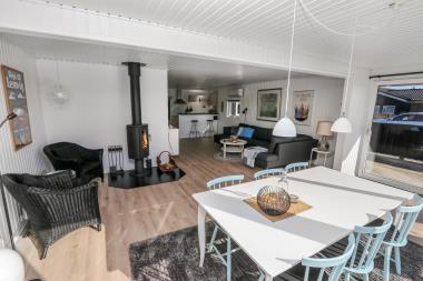 Huset er 106 m2 stort og har 3 soveværelse (1DS, 1DS, 2ES) . Lyst og venligt indrettet med kombineret opholdsstuen og køkkenhjørne. I den rummelige opholdsstue er er polstermøbler, TV med danske og tyske kanaler, spisebord tæt ved køkkenhjørnet, Radio / DVD / CD og en dejlig brændeovn sørger sammen med varmepumpen under loftet for at minimere el-regningen. Dejligt køkkenhjørne med alt i service / køkkengrej. Der er el-keramiske kogeplader, indbygningsovn, emhætte, mikroovn, emhætte, opvaskemaskine og køleskab med fryseboks. Stort, indbydende badeværelse i afstemte farver med klinkegulv med gulvvarme, vaskemaskine, tørretumbler, bruseniche, toilet og håndvask. Dette dejlige træhus er bygget i 1986, renoveret i 2004 og i 2020 er der lagt nye trægulve i hele huset. Har man el-bil eller en Plug-In hybrid, så er der ved Ladeboks til Type 2 ladestik, der kan lade op til 11 kWh. Ikke-ryger hus. 2 husdyr tilladt