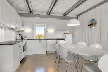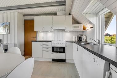 Køkkenet og stuen er i et rum, så man har gode muligheder for at samles og hygge. Hele rummet er indrettet lyst og tiltalende. Stuen har brændeovn, stereoanlæg med CD samt en fladskærm og tyske satellitkanaler, som modtaget via parabol. Hertil er der også en DVD-afspiller, så glem ikke dine yndlings-DVD’er til ferien. Stuen har også en sofagruppe i hjørnet med tilhørende sofabord. Herfra har man også mulighed for at gå direkte ud på terrassen. Køkkenet har både glaskeramisk komfur, mikro-ovn, opvaskemaskine, køleskab samt fryser på 80 liter. Der er 2 badeværelser hvoraf det gulvvarme, spa, håndvask og sauna og det andet har bruser og toilet. De 4 soveværelser er placeret så i den ene ende af huset er der 2 soveværelser med en dobbeltseng i det ene værelse og 2 enkeltsenge i det andet værelse. Så i den ene ende kan een familie fint bo. I den anden del er opdelingen tilsvarende så her kan den anden familie bo. Herudover er der endvidere vaskemaskine og tørretumbler i huset.