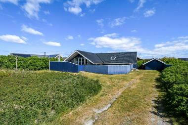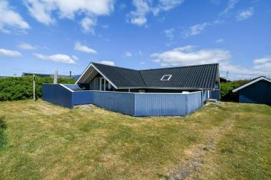 Fra opholdsstuen er der udgang til et stort terrasseanlæg med stakit. På den store, delvis overdækket, lukket træterrasse er der havemøbler, grill og liggestole. Sid ugeneret på terrassen og nyd udsigten når solen går ned bag de høje klitter mens lyden af Vesterhavets bølger nydes. Fra Stuen ses de høje klitter ved Vesterhavet som ligger kun ca. 300 fra huset. Det giver lyst og inspiration til en gåtur ved vandet uanset vejr og vind og byder hver dag på en ny fortælling. I sæsonen kan du hente morgenbrød, købmandsvarer eller måske invitere familien ud at spise kun ca. 5 min på gåben fra huset. Perfekt til en familie som ønsker central beliggenhed i dejlige rammer hele året rundt.