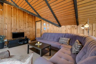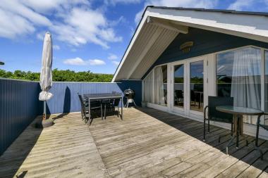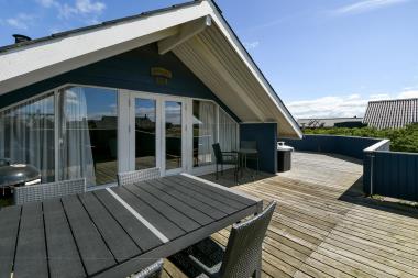 Fra opholdsstuen er der udgang til et stort terrasseanlæg med stakit. På den store, delvis overdækket, lukket træterrasse er der havemøbler, grill og liggestole. Sid ugeneret på terrassen og nyd udsigten når solen går ned bag de høje klitter mens lyden af Vesterhavets bølger nydes. Fra Stuen ses de høje klitter ved Vesterhavet som ligger kun ca. 300 fra huset. Det giver lyst og inspiration til en gåtur ved vandet uanset vejr og vind og byder hver dag på en ny fortælling. I sæsonen kan du hente morgenbrød, købmandsvarer eller måske invitere familien ud at spise kun ca. 5 min på gåben fra huset. Perfekt til en familie som ønsker central beliggenhed i dejlige rammer hele året rundt.