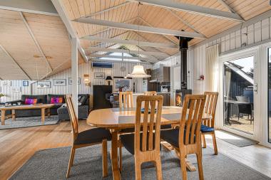 Dette træferiehus på 88 m2 er bygget i 1978 og er løbende renoveret. Der er god plads til 6 personer. Kombineret stue og køkken som er åben til kip. De store vinduespartier i huset giver en fantastisk lysindfald i rummet. Stuen er indrettet med polstermøbler og spisebordet er placeret tæt på køkkenet. Stuen er med TV og tyske programmer, CD og DVD afspiller. Stuen råder også over en dejlig brændeovn som sammen med varmepumpen sørger for en behagelig varme uanset årstid og begge er medvirkende til en lavere forbrugsafregning. Der er 3 soverum: 1DS + 1DS + 2S. Til de mindste gæster er der barneseng og barnestol. Køkkenet er indrettet med glaskeramisk komfur, køle-/fryseskab, mikroovn og opvaskemaskine. Badeværelse med toilet, håndvask og bruser samt gulvvarme. Vaskemaskine er også installeret. Ikke rygerhus og husdyr er ikke tilladt.
