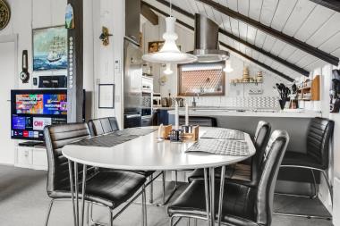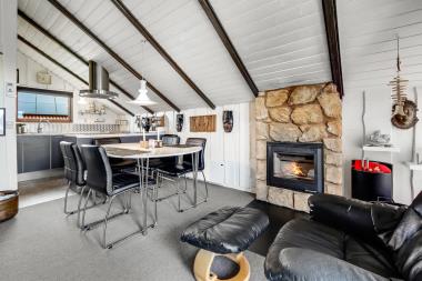 Husets hyggelige stue har brændeovn og hyggehjørne med sofagruppe og fladskærm. Her er mulighed for at se DR TV med Chromecast og tyske satellitkanaler via parabol. Der er desuden en stereo med CD. Der er installeret varmepumpe i huset og det betyder at du som gæst kan spare en del på din elvarmeregning – varmepumpen leverer op til 4 gange så meget effekt som den bruger, det betyder at for hver kilowatt-time pumpen bruger yder den varme svarende til ca. 4 kW energien udnyttes dermed langt bedre Køkkenet ligger i forlængelse af stuen og her er moderne bekvemmeligheder såsom glaskeramisk komfur, mikrobølgeovn, opvaskemaskine, køle/fryseskab samt en separat fryser på 90 liter hvis man for eksempel skal bruge plads til friskfanget fisk. Her findes i alt 3 soveværelser hvor 2 er med dobbeltsenge og én er med 2 enkeltsenge. I baderummet er der er gulvvarme, bruser, vask og toilet. Der er endvidere vaskemaskine og gratis internet i sommerhuset.