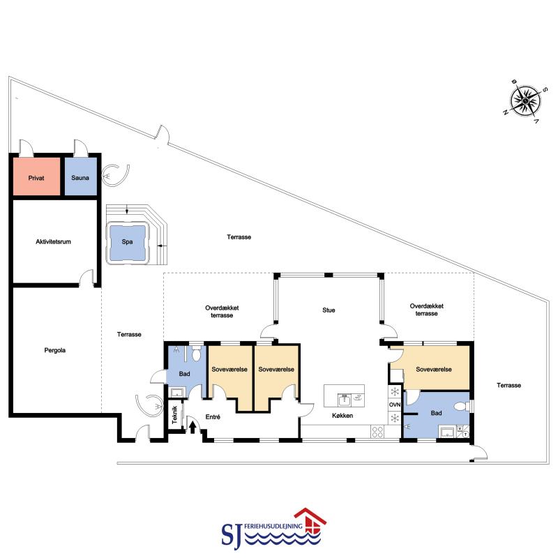 Der er udgang til det store og unikke terrasse anlæg, hvor der også er en udendørs spa og 2 udendørs brusere med koldt og varmt vand. 2 badeværelser begge med toilet, håndvask og bruser samt klinkegulv med gulvvarme, det ene er vaskemaskine og tørretumbler. Fra det ene badeværelse er der desuden udgang til terrassen og en af bruserne, så man kan gå i bruser, hvis man har været en tur i Vesterhavet og derefter gå ind i huset gennem badeværelset. Huset lejes ikke ud til ungdomsgrupper. Har man el-bil eller en Plug-in hybrid, så er der opsat lade boks. Ikke ryger hus. Husdyr ikke tilladt. Obligatorisk slutrengøring