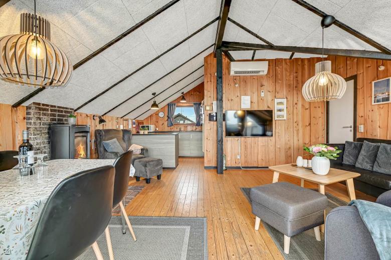 Der er trægulve i alle rum, vægge og lofter er beklædt med træ. Lækkert nyt badeværelse med toilet, håndvask, bruser og opvarmet flisegulv. Huset har 2 gode soveværelser: 1 med DS 160 cm bred og 1 med 2 ES hver 80 cm bred. Veludstyret nyt køkken som er kombineret med stuen. Køkkenet indeholder bl.a. Keramisk komfur, emhætte opvaskemaskine, vaskemaskine, mikroovn, 40 liter fryser og køleskab. Desuden er der gratis trådløst Fibernet. I opholdsstuen er der brændeovn, stereoanlæg med CD, samt 50 ” Smart Tv med indbygget chromecast og med DR kanalerne. Samt tyske satellitkanaler. Der er installeret varmepumpe i huset og det betyder, at du som gæst kan spare en del på din elvarmeregning – varmepumpen leverer op til 4 gange så meget effekt som den bruger, det betyder at for hver kilowatt-time pumpen bruger yder den varme svarende til ca. 4 kW energien udnyttes dermed langt bedre. Huset er hyggeligt indrettet. Max 1 stk. husdyr tilladt. Dette feriehus er ideelt for den lille familie, som ønsker fred og ro og hvor man lade dørene stå åbne, uden at tænke på om de små børn eller hunden løber for lang væk.