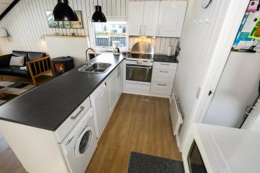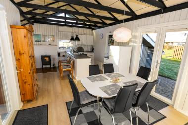Et godt udnyttet træhus på 64 m2 med gratis Internet. Bilen parkeres lige ved huset og indgangen til huset nås via den lukket terrasse. 3 soveværelser (1DS, 2ES, 1ES) med gulvtæpper. Hyggelig opholdsstue med nye lædermøbler, fladskærms tv med tyske og danske kanaler. Den nye, dejlige brændeovn understreger hyggen i rummet og sammen med den nye varmepumpe minimeres forbruget i huset til et minimum. Godt køkkenhjørne med komfur med keramiske kogeplader, emhætte, køleskab med lille fryseboks, opvaskemaskine samt vaskemaskine. Der er praktiske trægulve i køkken og opholdsrum. Huset badeværelse er også nyrenoveret i flotte afstemte farver og har klinkegulv med gulvvarme, toilet, håndvask og bruseniche. 2 husdyr tilladt. Ikke ryger hus.