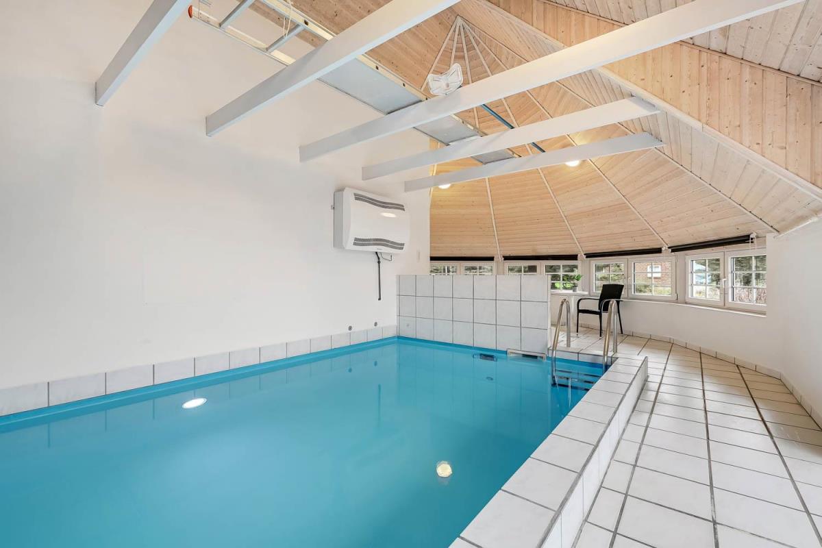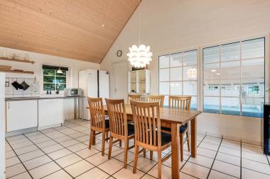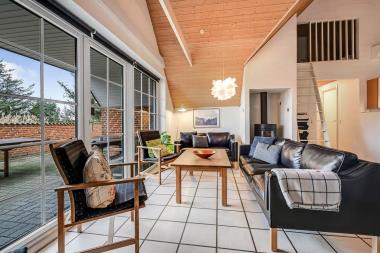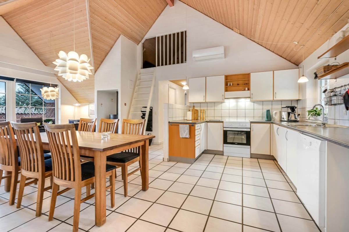 Huset er 165 m2 stort og har 4 dejlige soverum (1xdobbeltseng, 1xdobbeltseng, 2xenkeltsenge og 4xkøjesenge) samt en hems med 2 sovepladser til begejstring for mange børn og barnlige sjæle. I hjertet af huset findes et veludstyret køkken/alrum hvor loftet går til kip og hvor småsprossede vinduer bidrager til den hyggelige feriestemning. Her er alt i hårde hvidevarer; komfur med glaskeramiske kogeplader, emhætte, opvaskemaskine, mikroovn, stort amerikanerkøleskab med fryseboks og sågar et vinkøleskab. Nyd maden ved spisebordet eller slap af i de behagelige sofamøbler. TV i stuen er med danske og tyske kanaler og der er mulighed for brug af Chromecast. Der er ekstra TV og DVD på hemsen, hvor man kan lave sin egen lille biograf. Skulle det blive for koldt, eller skal stemningen blusses op, sætter man blot gang i husets brændeovn, hvor flammerne og den intensive varme kan nydes. Der er hvide klinkegulve i stue og køkkenområde med gulvvarme og der er gulvtæpper/parketgulve i soveværelserne. Husets wellness pool-afdeling rummer udover poolen et spabad og en sauna og huset har hele 3 badeværelser, med toilet, bruser, håndvask samt gulvvarme og en luft til vand varmepumpe. Vaskemaskine og tørretumbler er en selvfølge og er placeret i husets entré. Der er udgang fra opholdsstuen til husets store og delvise overdækkede samt indhegnede terrasse. På terrassen er der havemøbler, parasol, solsenge, sandkasse, rutchebane, bord/bænkesæt til de små m.m. Inde i huset er der en barneseng, der kan slåes op, til de helt små. Huset er et ”ikke ryger hus”. Max. 2 husdyr er tilladt. Der er installeret varmepumpe i huset, hvilket betyder at du som gæst kan spare en del på din elvarmeregning – varmepumpen leverer op til 4 gange så meget effekt, som den bruger. Huset lejes ikke ud til ungdomsgrupper. Har man el-bil eller en Plug-In hybrid, så er der mulighed for opladning gennem opsat ladeboks på gavlen i den nordlige ende af huset. Depositum vintersæson kr. 3.000 og sommersæson kr. 2.200.